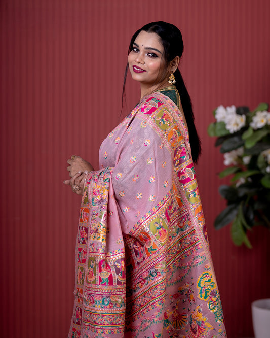 Drape yourself in the sheer grace of our Pashmeena Cotton Silk Weaving Saree, intricately crafted with resham threads and zari for a mesmerizing appeal. The stunning, eye-catching designs add a touch of timeless beauty, making every moment special.