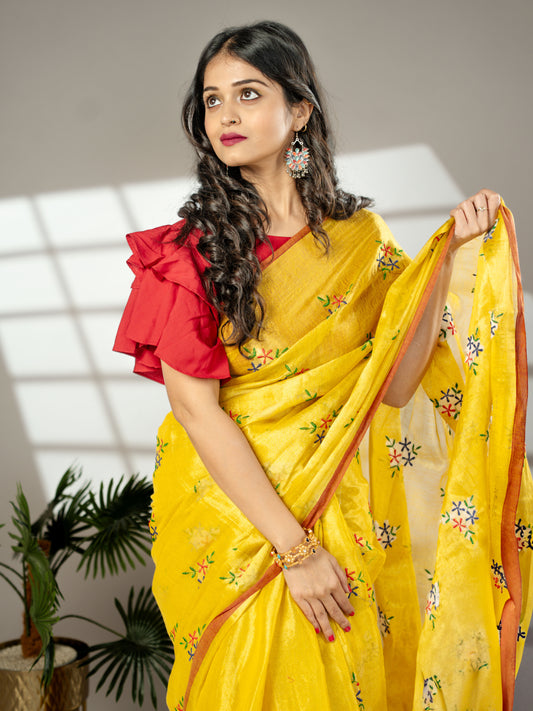 Our range is thoughtfully curated—cotton, linen, crepe silk, Jamdani linen, Maheshwari, Banarasi and more—balancing comfort with elegance for everyday wear, celebrations, office days, and everything in between